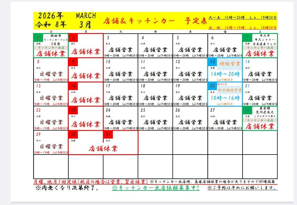 3月店舗&キッチンカー予定表